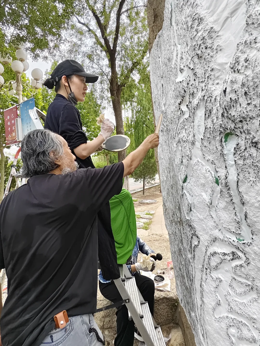 时光流转,一晃几十年过去了,石面风化剥落,石刻损坏严重,字体已漫漶不清。为了让文化的传承之火不熄灭, 2024年7月,流火季节,水香洲文化艺术中心刘建洞先生的脑海里构思了一个盛世传承的大工程。遂邀请年届耄耋之年的著名金石书画、鉴藏家刘栋先生率女棣陈雨杉,于飞拓石。面对破损严重的石刻,王学仲先生的原稿又难于找到的纠结,为了最好地复原王学仲先生的书迹,决定采用颖搨之法复原。