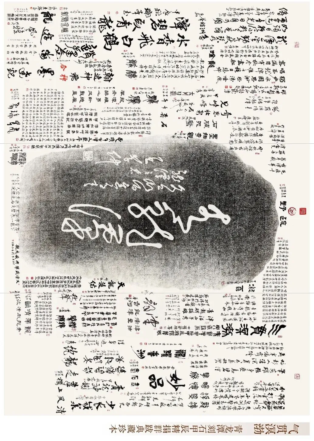 著名史学家罗澍伟先生题跋;”吾津沽城南青龙潭畔,有水香洲,民国张镒別业,尝为津门文士雅集之所,名播远近。今人刘君建洞,躬逢盛世,虔心弘文,以赓续水香洲文脈为己任,茲以上世纪八十年代末,书坛巨擘王学仲书丹,篆刻名家解心逸泐石之青龙潭刻石为原本,特邀名家刘栋率女棣陈雨杉、于飞精搨一幅,鼎力玉成。斯气貫冥(溟)渤,高逾丈,广邀博雅君子群跋其上,集刻、拓、詩、书于一体,诚当代拓艺之巨帙,雅俗共赏之珍品,必将随岁月更迭,典藏传世,昭显乡梓文化于未来也“。罗先生的题文述说着青龙潭畔的历史传奇,水香洲的古韵仿佛在眼前徐徐展开。著名画家、教育家陈冬至先生跋文:“昨日盘谷小醉,今朝龙潭高歌“。尽显豪迈洒脱。