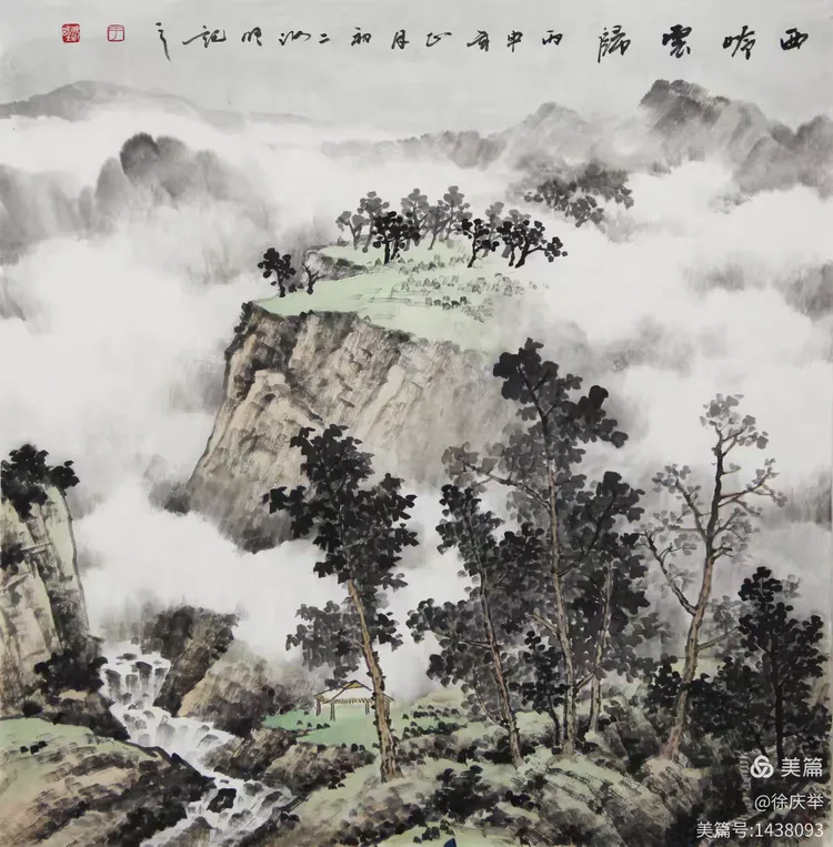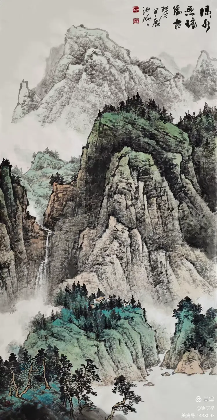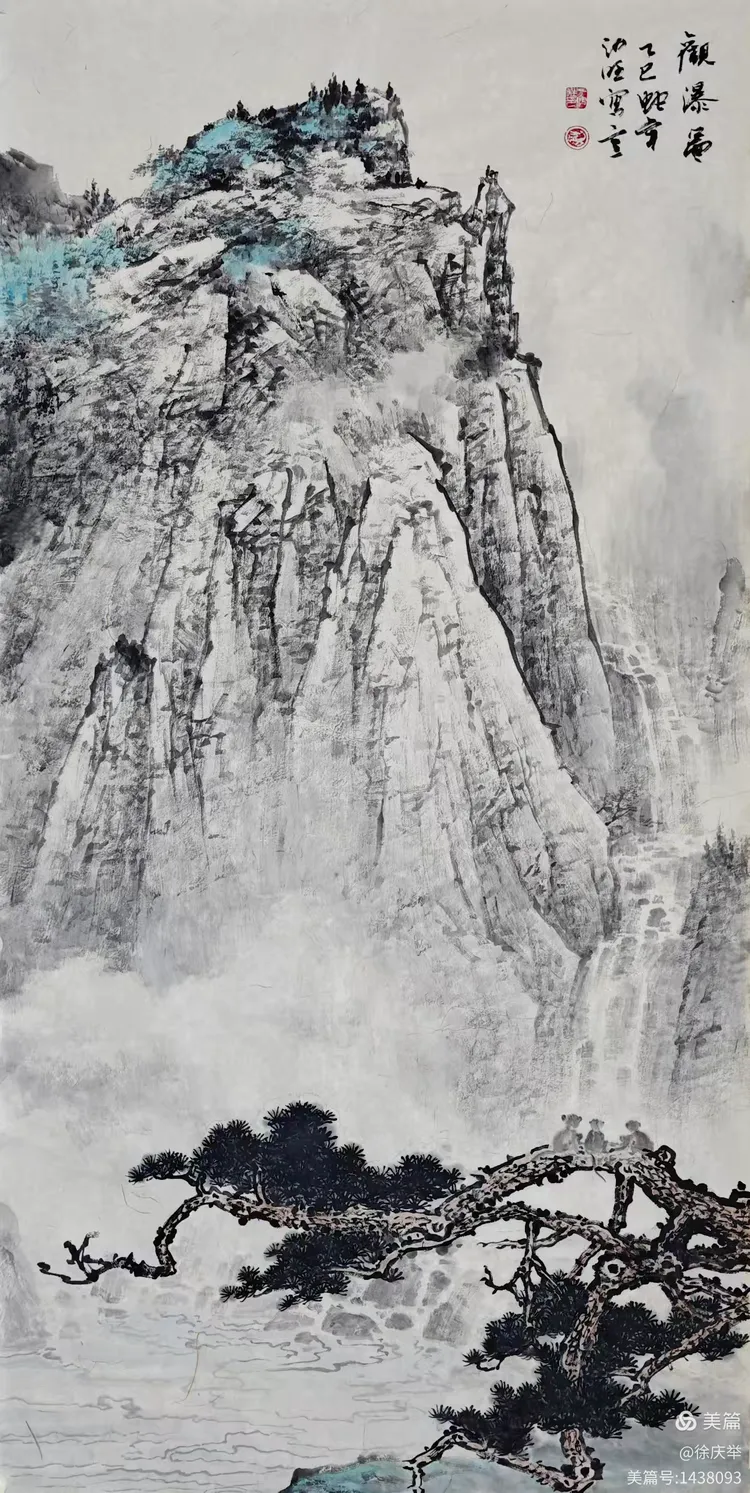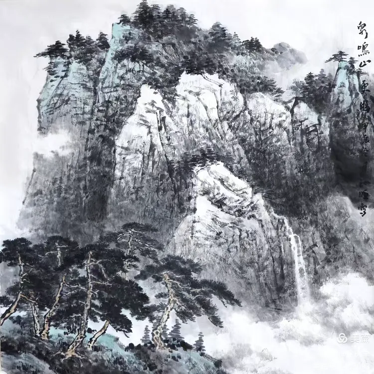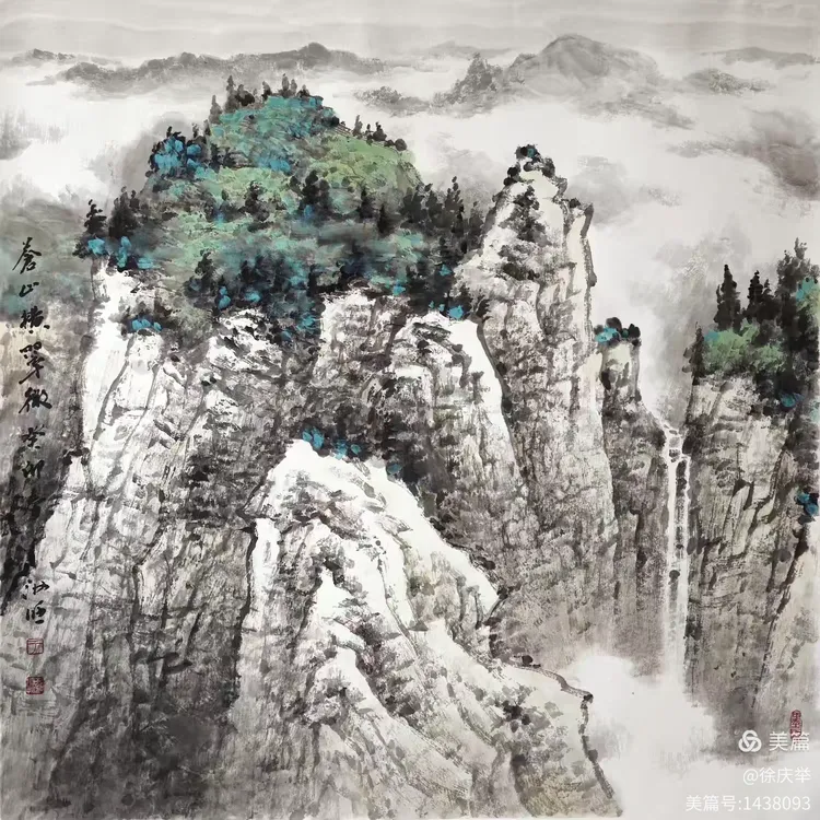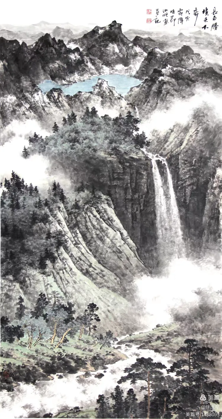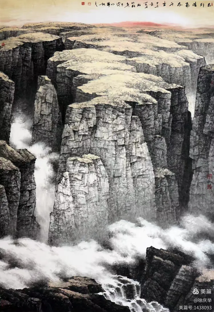 山水峨峨,摘冠夺宗,写意山川,腾氤氲而浮岚,浴真炁而繁盛。嗟尚兮泻水帘之摩云,惊羡兮耸巉岩之接天。猗与望之,势如远山升浩莽;噫嘻顾之,形如近水漾漪澜。构图奇巧,布局臻善。灵若飘逸,韵如流转。