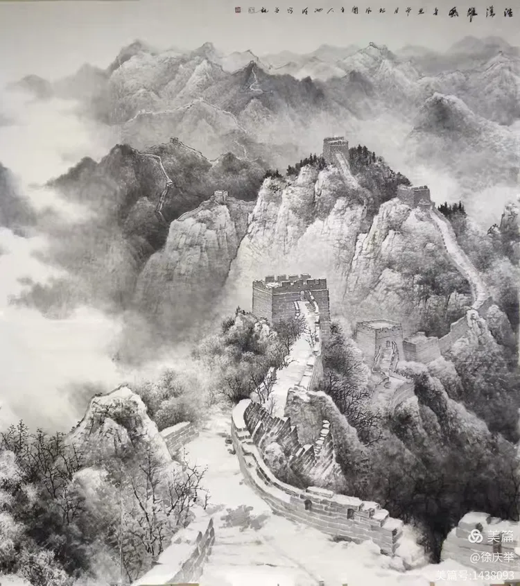 于汝旺表现长城的作品《浩荡雄风》也是比较成功的,焦点与散点透视的结合运用,作品的构图及表现的视角,不仅表现了长城的绵延逶迤,还刻画了纵向深远以及辽阔,画面中黑白的对比,虚实的对比,疏密关系的对比,处理得较好,在大量的画长城的画家里,是比较优秀的作品。