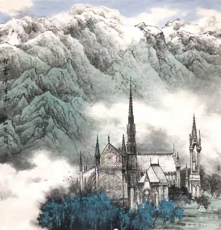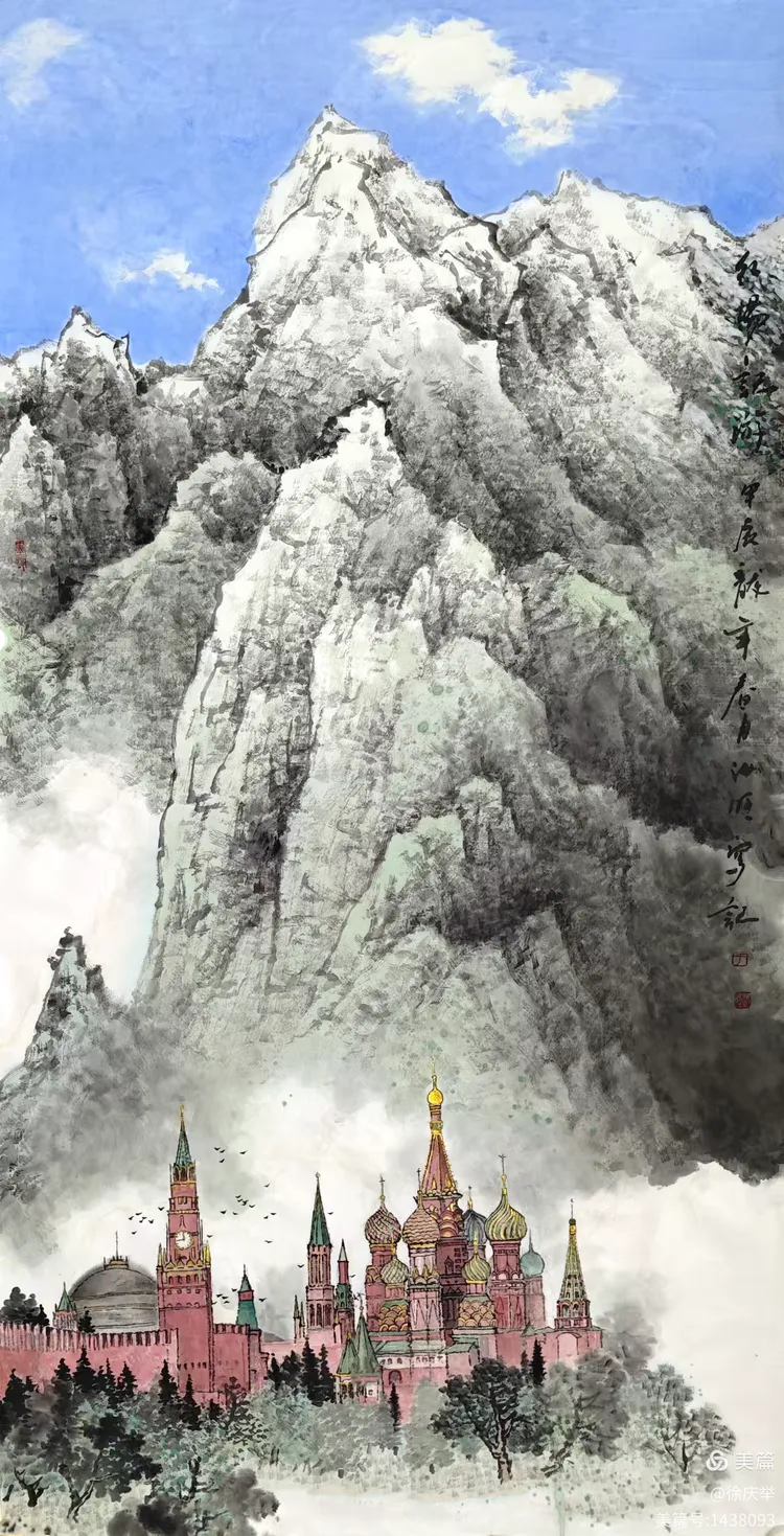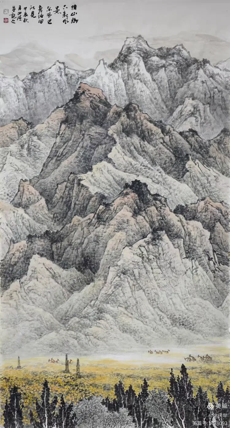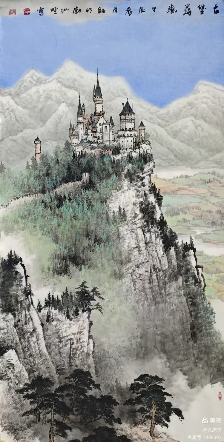 师恩钊先生开创新北派山水至今,我参与了他的很多展览和研讨活动。展览已经出现了很多以创新的笔墨来描绘世界名山大川的佳作,画的既有传统中国画的气韵,又贴近当代人的审美意识,非常精彩。于汝旺的《古堡寻幽》这幅画表现的尤为突出,主体建筑简约而不简单,线条精准又有变化,把西画的立体用中国画元素融合到一起不容易,加上放在约占三分之一画面的大山上,气势也够。悬崖下面推远虚景处理的非常精彩,与近景的树,主景的大山,产生强烈的对比。如主山后面的远山和云再虚幻一些会更好。中国画注重的是意,在于写,不是描摹,这幅作品成功之处就是做到了这关键的一点。