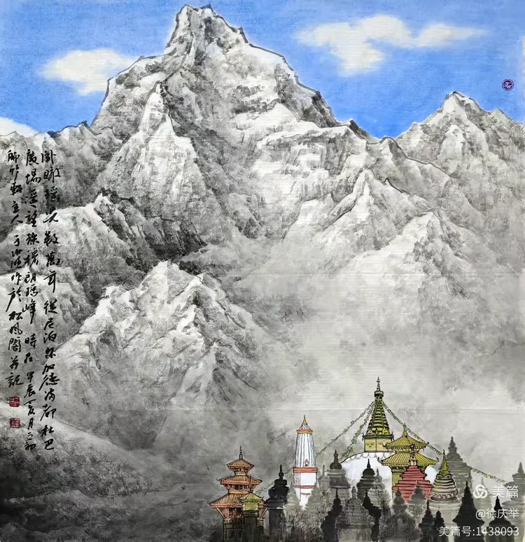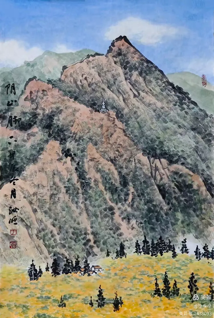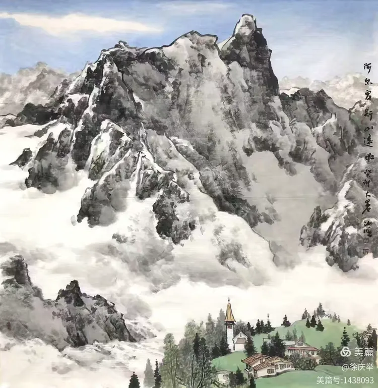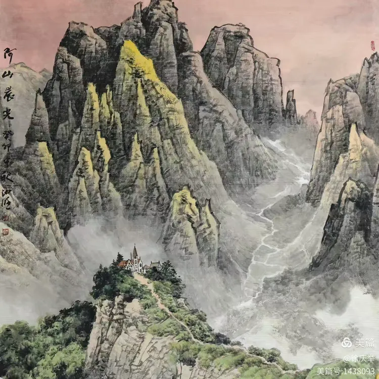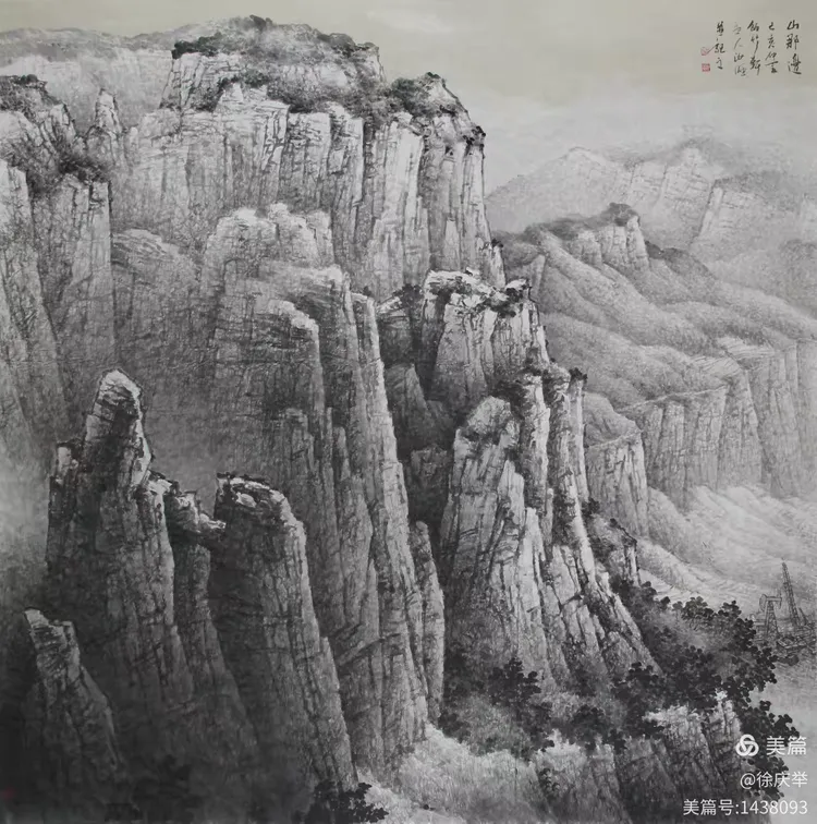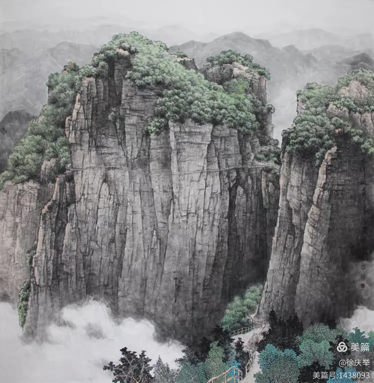 师恩钊先生开创新北派山水至今,我参与了他的很多展览和研讨活动。展览已经出现了很多以创新的笔墨来描绘世界名山大川的佳作,画的既有传统中国画的气韵,又贴近当代人的审美意识,非常精彩。于汝旺的《古堡寻幽》这幅画表现的尤为突出,主体建筑简约而不简单,线条精准又有变化,把西画的立体用中国画元素融合到一起不容易,加上放在约占三分之一画面的大山上,气势也够。悬崖下面推远虚景处理的非常精彩,与近景的树,主景的大山,产生强烈的对比。如主山后面的远山和云再虚幻一些会更好。中国画注重的是意,在于写,不是描摹,这幅作品成功之处就是做到了这关键的一点。