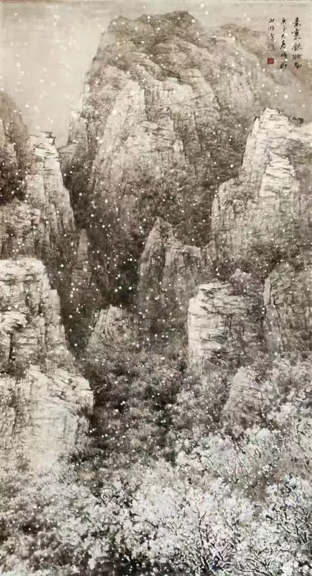 于汝旺《素裹银妆》这幅作品有突破,有新意,非常好。每个画家都有自已的习惯画法,汝旺的山水风格十分明显,已形成一种样式。这次看出他不囿于自我,敢于求索探新,这画画得朦胧洇润,意境很好。我觉得我们北派画家就要这样不断突破不断进取。你们每人的突破变化,我都能一眼看出的。