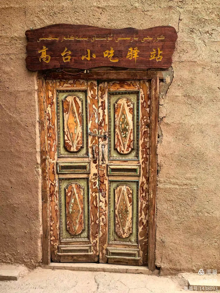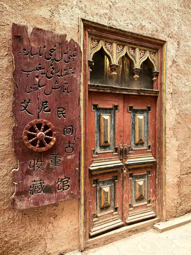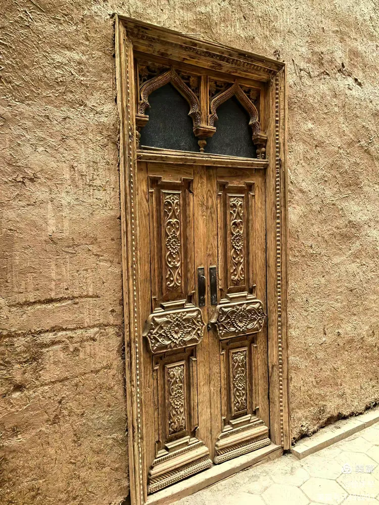 我非常喜欢维吾尔族建筑的户外大门,颇具艺术美感。这些大门多为两扇门,庄重厚实,门上镶有、刻有图案花纹的铜质、铁质护板压条。吊装两个碗大的门环供上锁用。