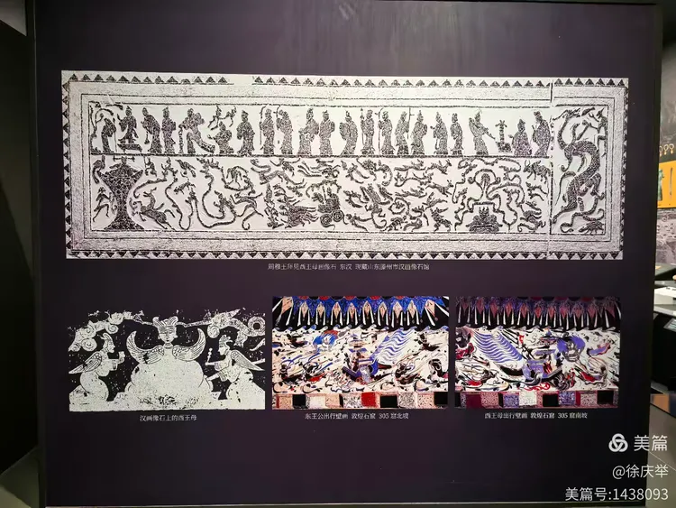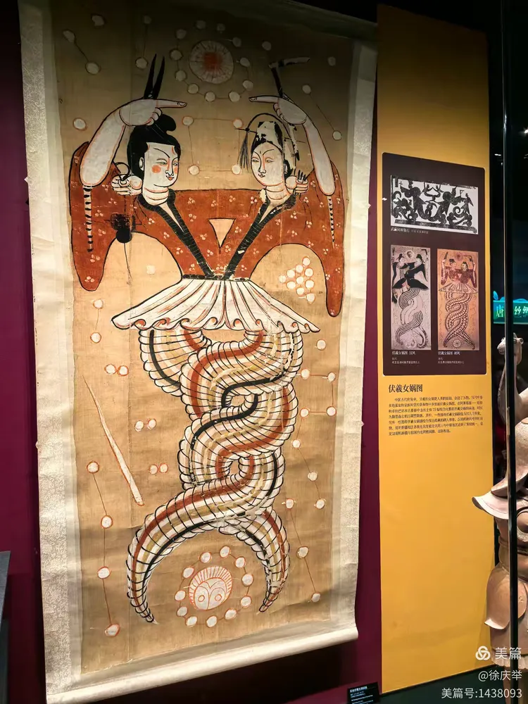 这是博物馆的精品文物《伏羲女娲图》(公元618~907年),创作于晋唐时期,主角是传说中的伏羲和女娲。《伏羲女娲图》是用绢本设色而成的,纵长225.5厘米,上横107厘米,下横75厘米,又名“人首蛇身图”。1965年,《伏羲女娲图》于新疆阿斯塔那出土,现藏于新疆维吾尔自治区博物馆。伏羲是三皇五帝之首,中华人文始祖。女娲是造人之神,华夏孕育之母。神话传说中他们二人通婚,繁衍了人类。画中伏羲女娲上身相拥,侧面相觑,腰间的短裙下,蛇尾状的下身以螺旋结构盘旋相缠。代表了阴阳相对、生生不息。
