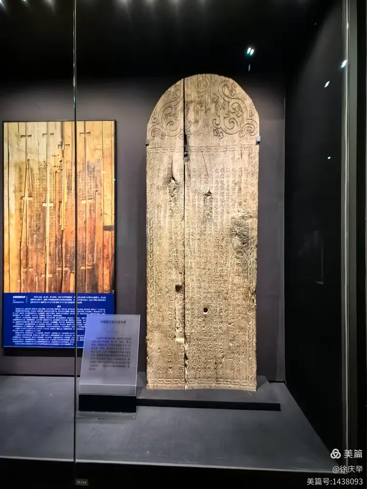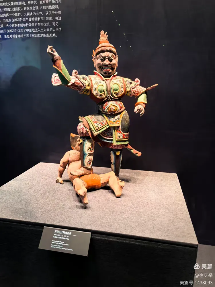 这是博物馆的精品文物〝彩绘天王踏鬼木俑”。这是一尊唐代彩绘木俑,高86厘米。木俑分为天王和小牛鬼两部分,整体施彩绘,色彩鲜艳。天王身着华丽的服饰,神态威严,而小牛鬼则是鬼状的形象。绘天王踏鬼木俑作为墓葬中的"守护神",被置于墓室门外,以保护墓主人的安宁。