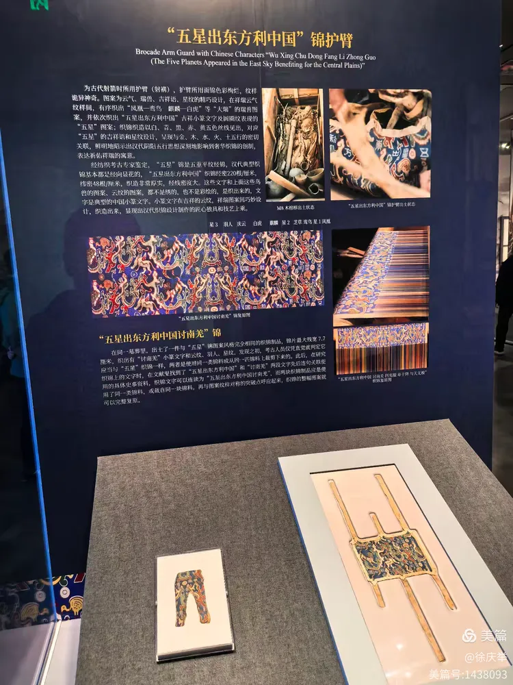 这是博物馆的精品文物“五星出东方利中国”,为汉代织锦护臂,国家一级文物,中国首批禁止出国(境)展览文物。被誉为20世纪中国考古学最伟大的发现之一。1995年10月,中日尼雅遗址学术考察队成员在新疆和田地区民丰县尼雅遗址一处古墓中发现该织锦。收藏于新疆维吾尔自治区博物馆。该织锦呈圆角长方形,长18.5厘米,宽12.5厘米,用“五星出东方利中国”织锦为面料,边上用白绢镶边,两个长边上各缝缀有3条长约21厘米、宽1.5厘米的白色绢带,其中3条残断。织有八个篆体汉字:“五星出东方利中国”。“五星出东方利中国”是中国古代占星用语,是古代先民观察五大行星运行变化而归纳总结出来的占辞术语。 五星指水、火、木、金、土五大行星;“东方”是中国古代星占术中特定的天穹位置,“中国”指黄河中下游的京畿地区及中原,是一个地理概念。而这句话的含义是,“金木水火土五颗星同时出现在东方的上空,有利于中原作战。”这是迄今为止在新疆境内发现年代最早的带有“中国”字样的文物。通过“五星聚会”研究,科学家们推算出2040年9月9日将会出现罕见的五星聚会天文奇观。