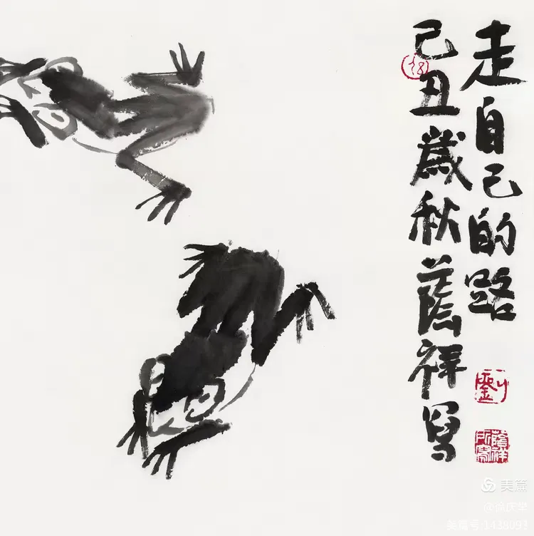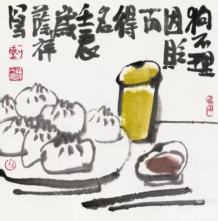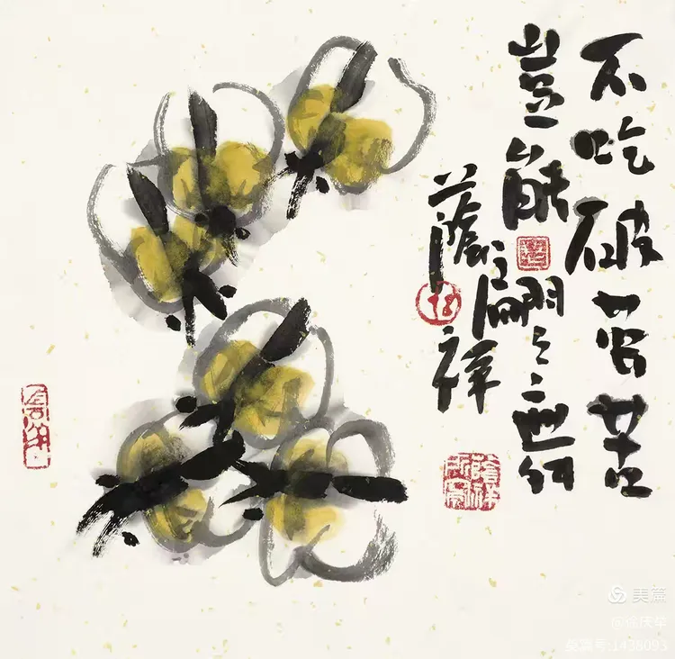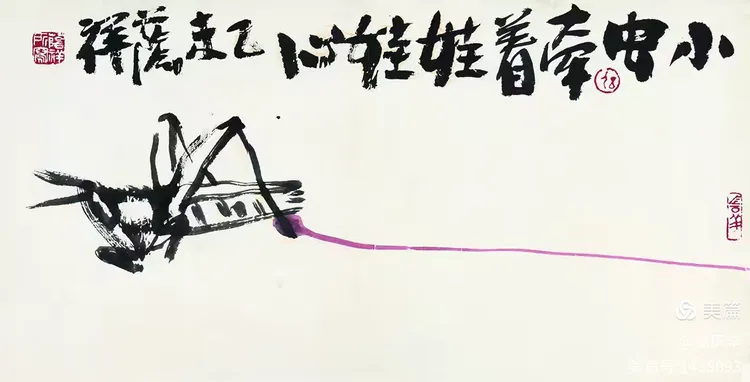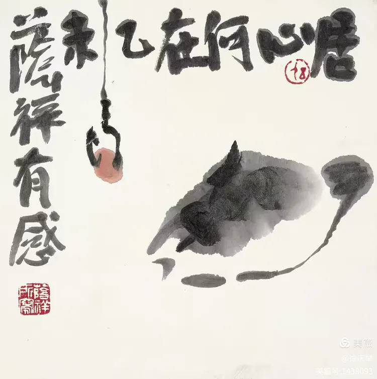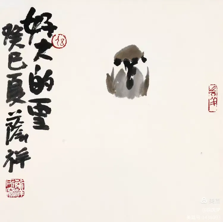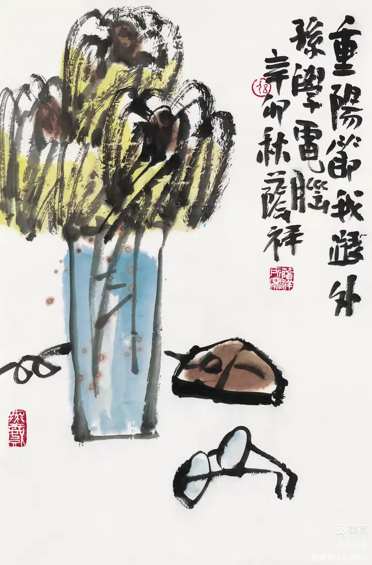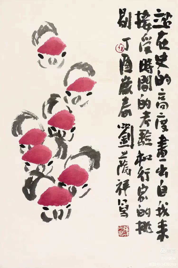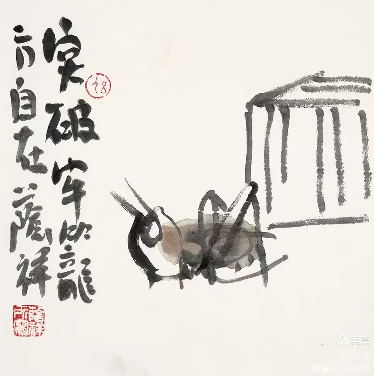 19、齐白石最大的功劳是敢于冲破当时的画风。他把着眼点放在生活的底层,也就是直接贴近生活。齐白石大胆将田间草虫、农家器物、日常蔬果如白菜、辣椒等 “底层生活元素” 纳入创作,将生活场景转化为诗意表达。画红花绿叶,色彩强烈;画虾也画到极致,从“雅”到“俗”,又从“俗”中体会到“雅”的境界。我们应当学习老人家的独创精神。