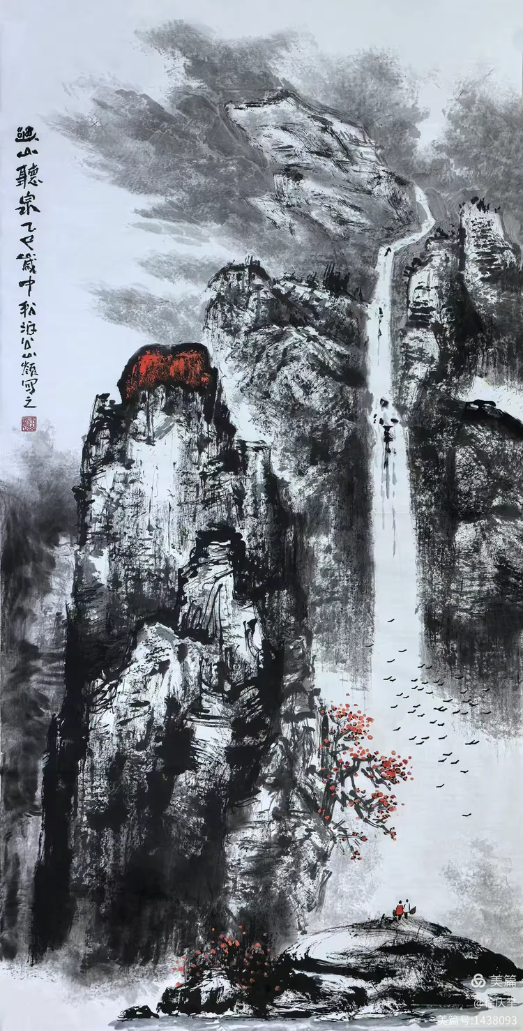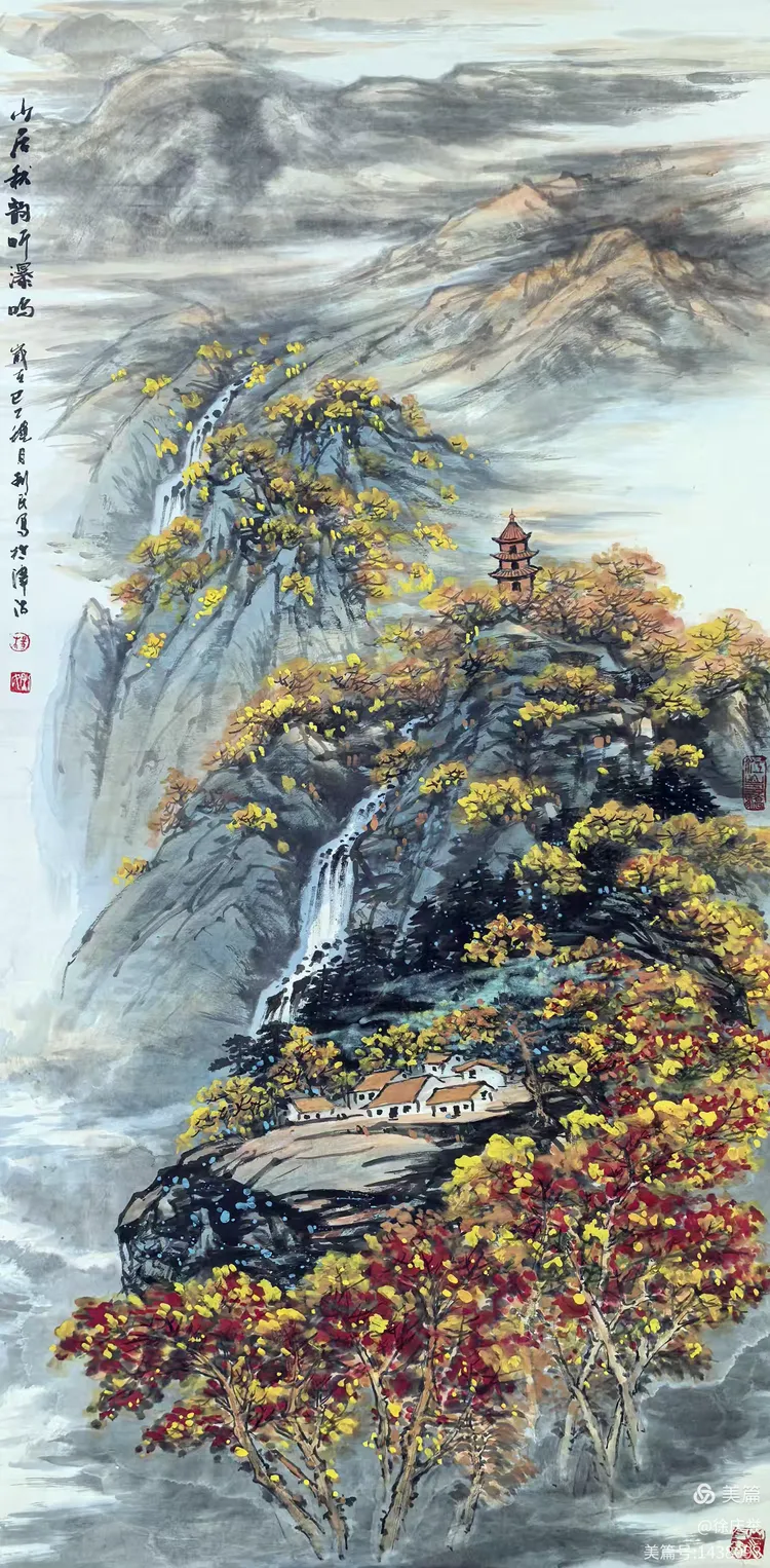 杨利民参展作品《山居秋韵听瀑鸣》。68x136cm