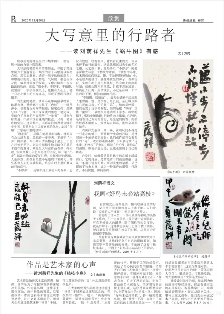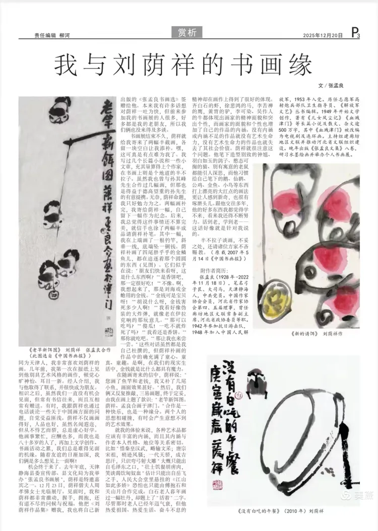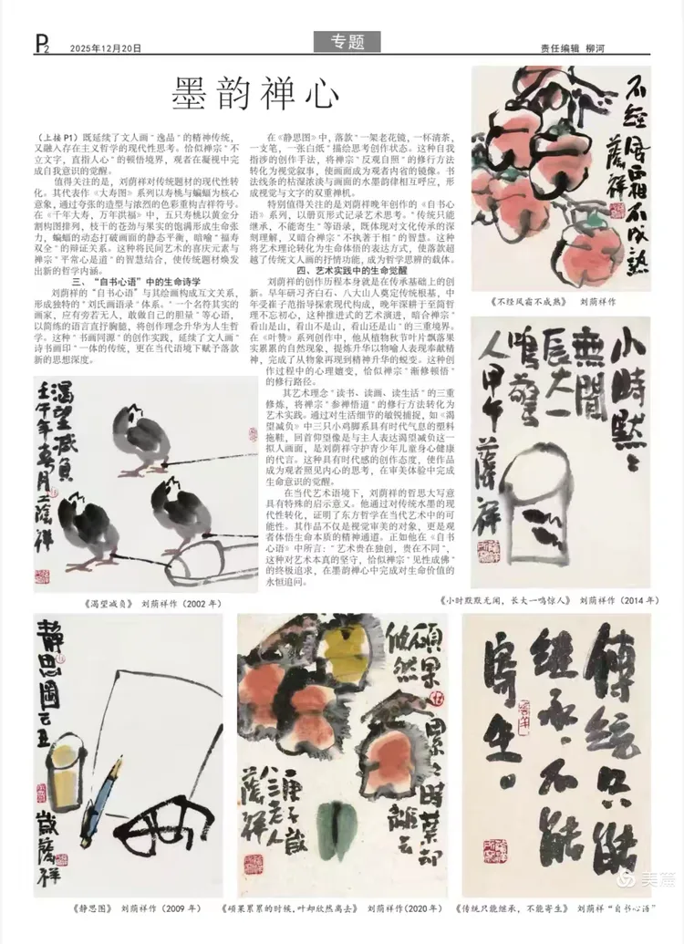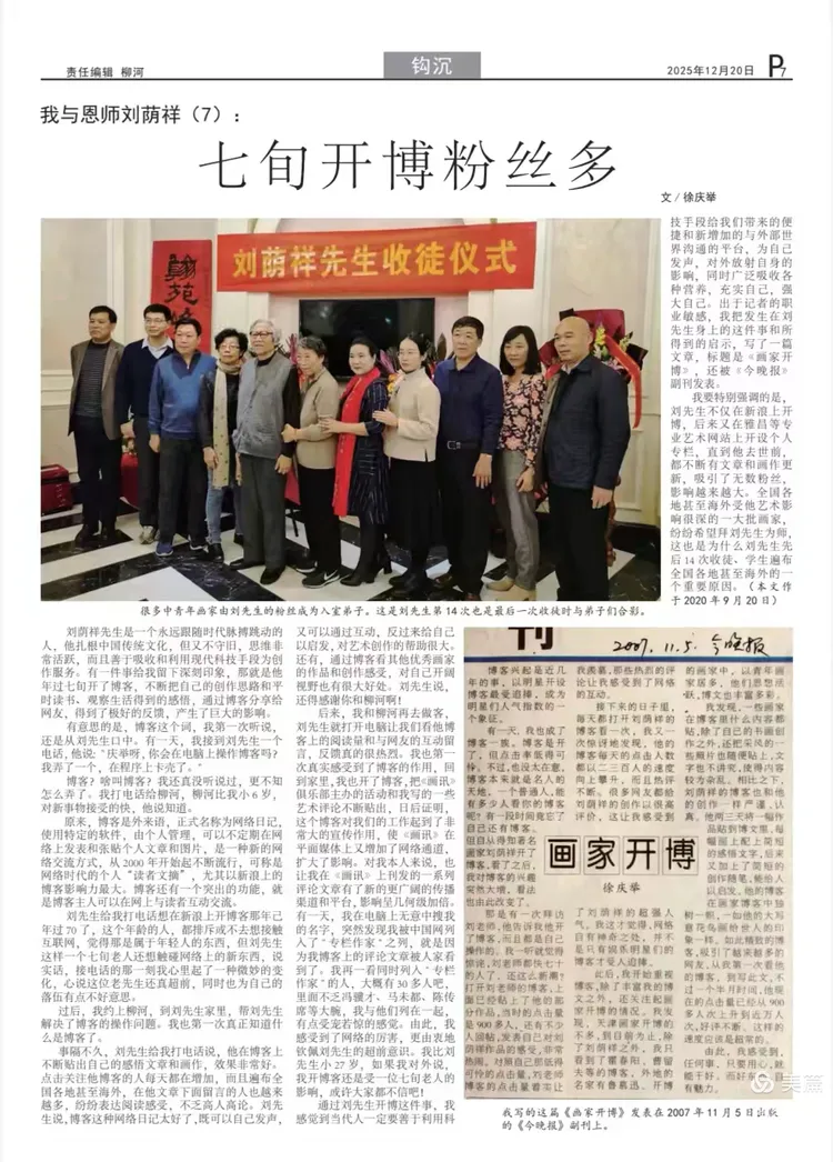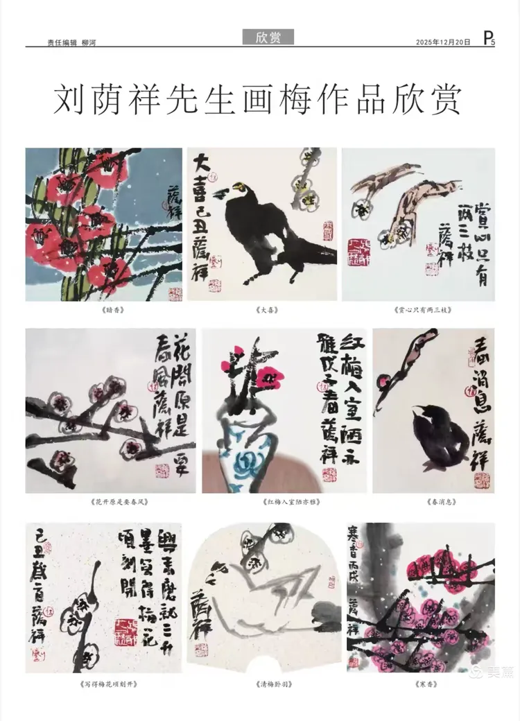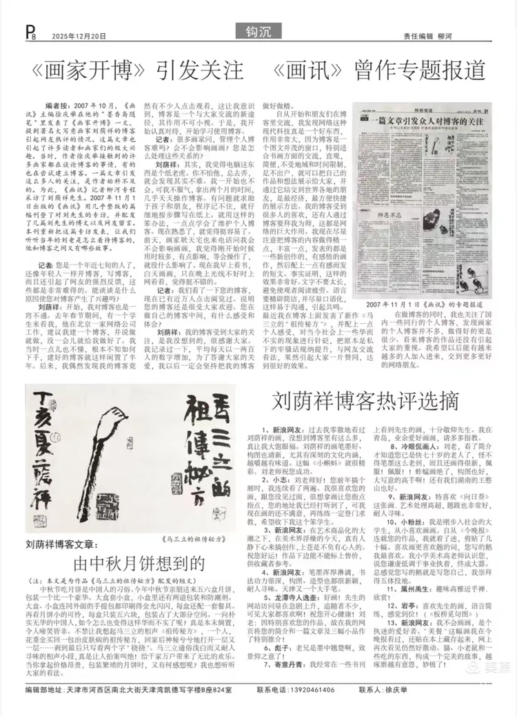 本期一版和二版刊登了作者周文撰写的文章《墨韵禅心一一刘荫祥大写意作品中的哲理与顿悟》,文中提到的九幅书画作品均刊载在版面上。三版刊登了天津老作家、长篇小说《血溅津门》的作者张孟良先生撰写的文章《我与刘荫祥的书画缘》,并配发了二人合作的作品。这篇文章选自2007年5月14日出版的《中国书画报》。四版刊发了作者方向撰写的文章《大写意里的行路者一一读刘荫祥先生<蜗牛图>有感》、刘荫祥先生博文《我画<好鸟未必占高枝>》以及作者朱尚春撰写的文章《作品是艺术家的心声一一读刘荫祥先生的<枯枝小鸟>》。现在正值隆冬,五版刊发了刘荫祥先生以梅花为主题创作的一组作品。六版继续刊发刘荫祥先生的“自说心语”,均是艺术创作方面的思考。七版刊登了弟子徐庆举撰写的系列文章“我与恩师刘荫祥”之七《七旬开博粉丝多》,回忆了刘荫祥先生在年届70的时候,依然紧跟形势,在新浪上开设博客,刊发自己的作品和艺术思考文章,吸引了全国众多粉丝的故事,同时配发了徐庆举于2007年11月在《今晚报》副刊上发表的记述这一经历的文章《画家开博》。八版是七版内容的延伸。当年,徐庆举撰写的《画家开博》一文同时在《画讯》上刊登,引发了天津书画界的普遍关注,《画讯》于2007年10月做了专题报道。该版将专题报道的内容进行了重新编辑并刊发,包括《画讯》记者对刘荫祥先生的访谈、刘荫祥先生博文摘登以及众多新浪网友在阅读刘荫祥先生图文之后的留言。博客虽然只是一个时期的热点,现在已冷却,但刘老在那个时期留下了大量文章,对研究他的艺术思想是十分宝贵的资料。