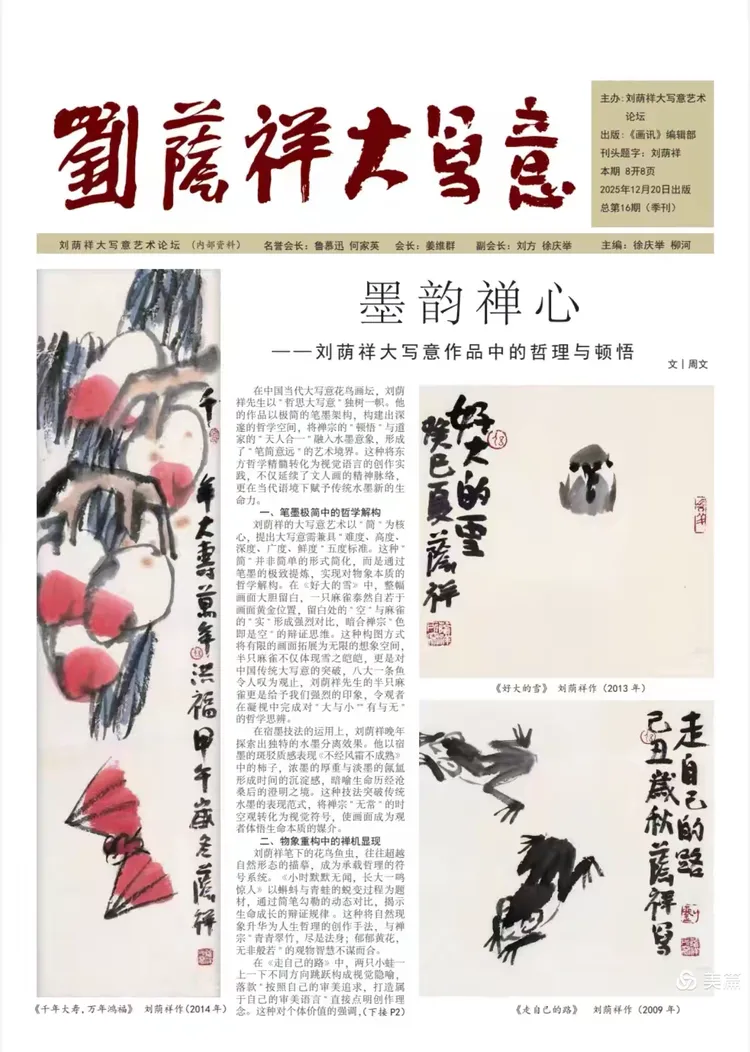 《刘荫祥大写意》会刊是研究、挖掘刘荫祥大写意艺术的学术季刊,目前已出版了16期。该刊以版面大气、内容丰富,作品精彩、内涵深刻、学术性强而引起广泛关注,全国众多网络媒体每期都予以转发,使更多的喜欢中国书画艺术尤其是大写意艺术的人们通过阅读会刊的文章和作品,全面而深刻地了解了刘荫祥先生在大写意花鸟画艺术上进行的不断探索以及取得的艺术成就。