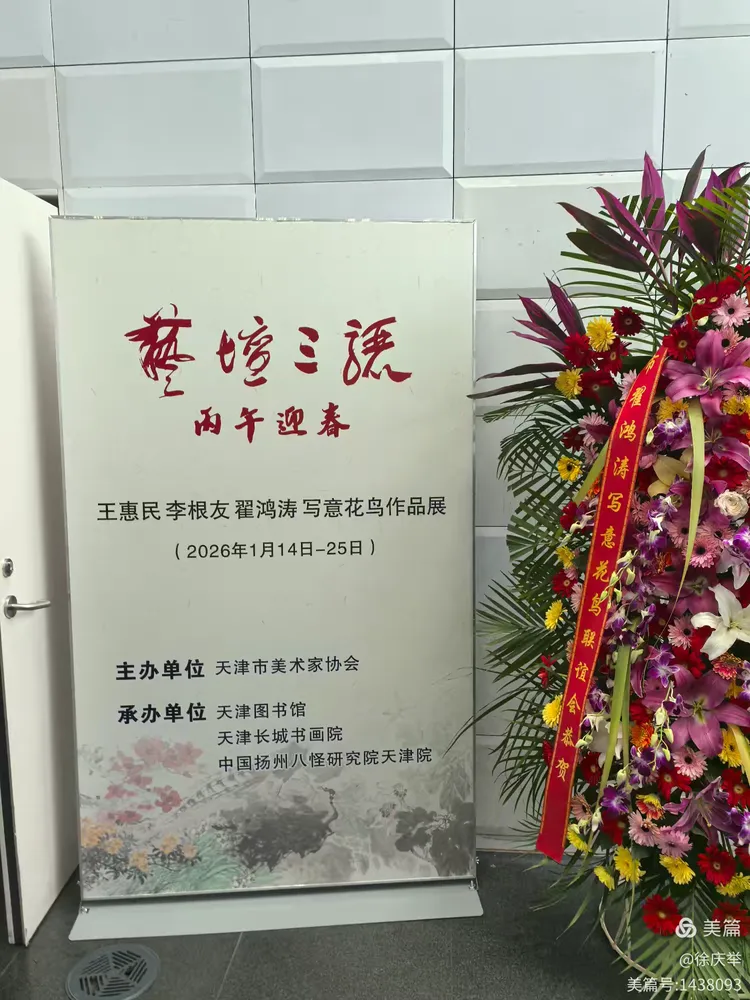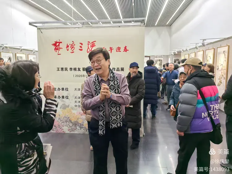 华北影响力讯(徐庆举报道):三骊彩笔绘芳辰,花鸟含情贺新春,津城联展添雅趣,墨色风华映古今。在丙午马年即将到来之际,由天津市美术家协会主办,天津图书馆、天津长城书画院、中国扬州八怪研究院天津院联合承办的"艺坛三骊 丙午迎春一一王惠民、李根友、翟鸿涛写意花鸟作品展",于2026年1月14日上午在天津图书馆文化中心馆区一楼展厅隆重开幕。