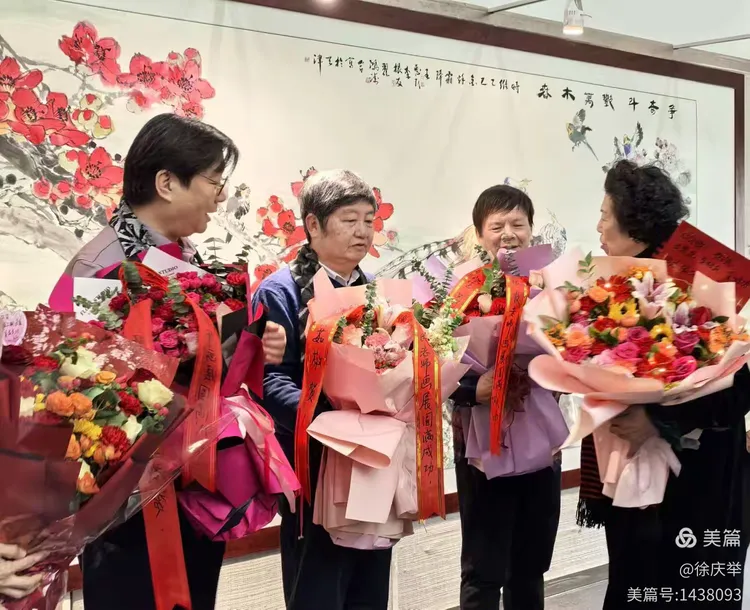 图为嘉宾吕爱茹为三位画家献花。