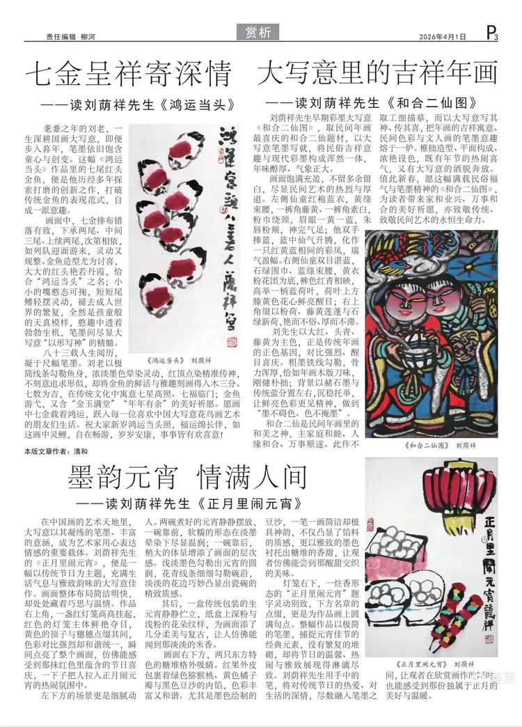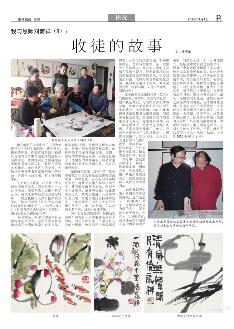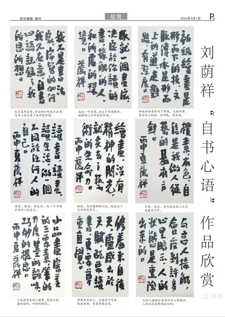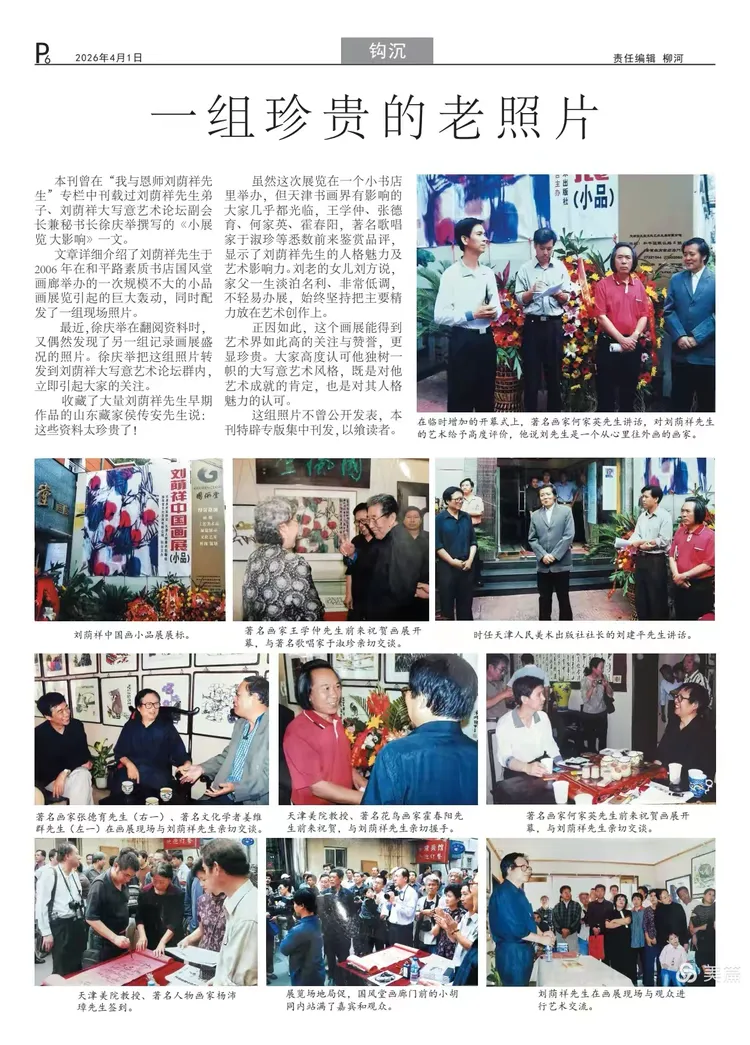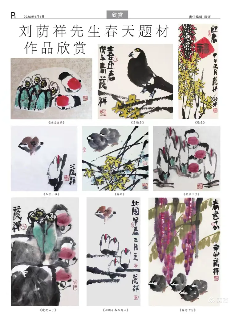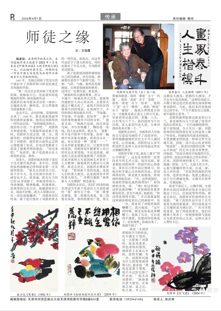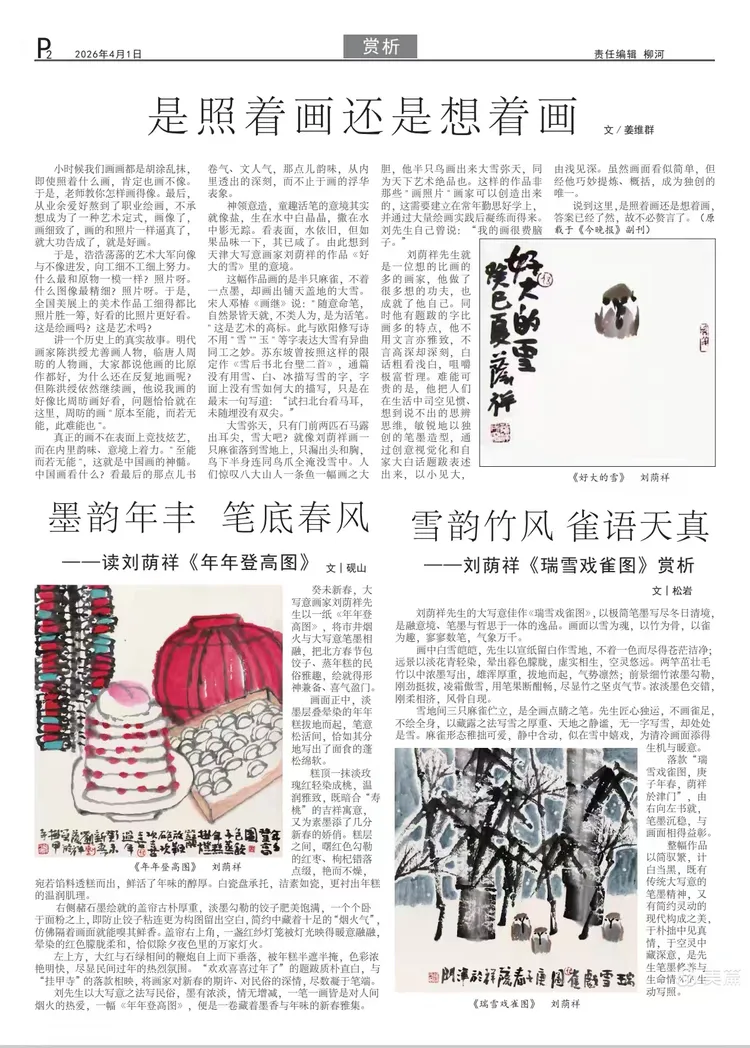 本期一至三版刊登了数篇解析刘荫祥先生艺术创作的评论文章,有宏观上的论述,也有对具体作品的感受,给人以启发。四版刊发了一组刘荫祥先生以春天为主题创作的作品,与众不同,非常精彩。五版继续刊发刘荫祥先生的“自说心语”,均是他在艺术创作方面的思考和感悟,文字简洁却有深度,又不失为独立的书法作品,是刘先生艺术创作的另一大亮点。六版刊登了弟子徐庆举在整理资料时发现的一组老照片,生动地反映了20年前刘先生一次规模很小的展览却引起巨大轰动的情景。七版刊登了徐庆举撰写的系列文章“我与恩师刘荫祥”之八《收徒的故事》,回忆了刘荫祥先生在14次收徒过程中发生的故事,说明刘先生在艺术上和作人上突出的个人魅力。八版刊登了传记作家王俊霞的文章《师生之缘》,在清明到来之际,缅怀崔子范、刘荫祥这一对为中国大写意花鸟艺术做出巨大贡献的师徒。