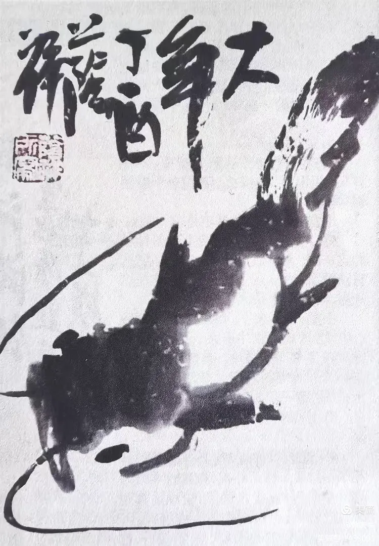 刘荫祥先生还是一个永不满足、永不停步的画家。尽管已成功地打造了一批艺术符号,但他在晚年依然不断探索、不断出新。其中,鲶鱼就是他着力打造的新的绘画形象,而且一经推出便令人叫绝。刘老推崇极简风格,笔下的鲶鱼用简单的几笔就勾勒出来,形象生动,笔墨饱满,极具艺术魅力和欣赏价值。中国画画繁容易画简难,没有深厚的笔墨功力和超强的对形象的提炼、概括能力,是画不出来简妙的大写意花鸟画作品的。在这一点上,刘荫祥先生的艺术功力可见一斑。尤为值得称道的是,刘荫祥先生在创作中不仅仅是为了打造一个形象,他还通过笔下的形象赋予深刻的艺术内涵。在推出鲶鱼这一形象后,他借用"鲶"的读音与"年"相同,在题跋中扩展了画面的含义。如他在一幅作品中画了两条鲶鱼,题款是"年年不忘初心",使观者联想到习近平总书记关于"不忘初心"的讲话,马上使作品有了鲜明的时代感,使人们在观赏画作的同时,思绪扩展,联想无穷,突破了观赏传统花鸟画的局限。还比如创作于2017年的《大年》,画中的这条鲶鱼本身从线条、笔墨和形象等几方面都有很强的欣赏价值,加上"大年"两字的题款,更使画面内容扩展,不仅有了节日的特性,还使观者联想到过年,联想到对美好事物的期盼。于是一幅画就有了温度、有了故事,添加了艺术魅力。